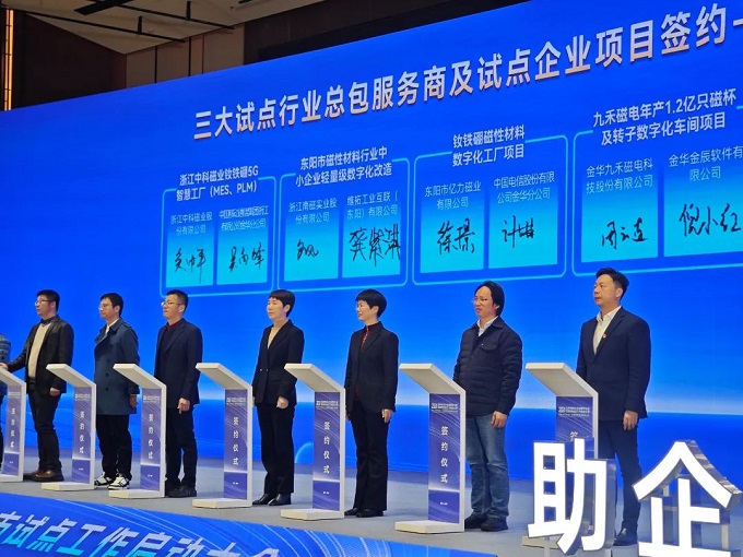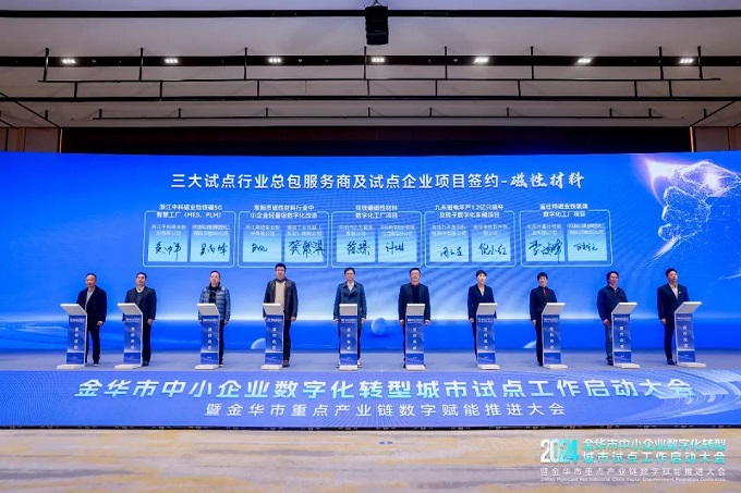金華金辰作為此次金華市中小企業(yè)數(shù)字化轉(zhuǎn)型城市試點(diǎn)總包服務(wù)商(電動工具、磁性材料),倪小紅女士代表參與了此次啟動儀式。在啟動會上與磁性材料試點(diǎn)企業(yè)——九禾磁電進(jìn)行項(xiàng)目簽約,率先開展數(shù)字化轉(zhuǎn)型實(shí)踐。標(biāo)示著金華金辰在金華政府的支持下,將逐步探索出一條符合本地中小企業(yè)實(shí)際情況的數(shù)字化轉(zhuǎn)型特色之路,為中小企業(yè)數(shù)字化轉(zhuǎn)型提供有效金華經(jīng)驗(yàn)!
