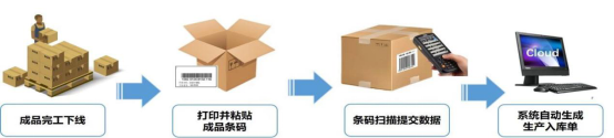 成品完工下線時(shí),將成品條碼打印并粘貼到包裝上,倉庫人員先掃描生產(chǎn)訂單,并逐一掃描成品條碼,系統(tǒng)自動(dòng)關(guān)聯(lián)生產(chǎn)匯報(bào)單生成產(chǎn)品入庫單。