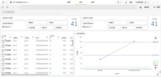 客戶化驗(yàn)數(shù)據(jù)單的結(jié)果,通過BI的方式展現(xiàn)。數(shù)據(jù)的維度是批號(hào),度量是化驗(yàn)項(xiàng)目的檢驗(yàn)值。查詢條件分成兩塊:一是根據(jù)日期范圍、母編號(hào)、子編號(hào)、產(chǎn)品名稱、批次號(hào)、分析項(xiàng)目來檢索數(shù)據(jù);二是根據(jù)日期范圍、母編號(hào)、子編號(hào)、產(chǎn)品名稱、批次號(hào)、分析項(xiàng)目來計(jì)算基準(zhǔn)值(比如UCL、LCL、CL+2σ、CL-2σ等)。整體數(shù)據(jù)展示,增加顯示滿足篩選條件統(tǒng)計(jì)的批次總數(shù);圖表數(shù)據(jù)表格展示(左側(cè)表格);通過UCL、LCL、上限、下限、CL+2σ、CL-2σ、平均、cp、cpk這些基準(zhǔn)值指標(biāo)來分析檢測(cè)值展示檢驗(yàn)結(jié)果的圖表(右側(cè)折線圖);增加分析項(xiàng)目檢測(cè)值單位顯示(折線圖左側(cè))。